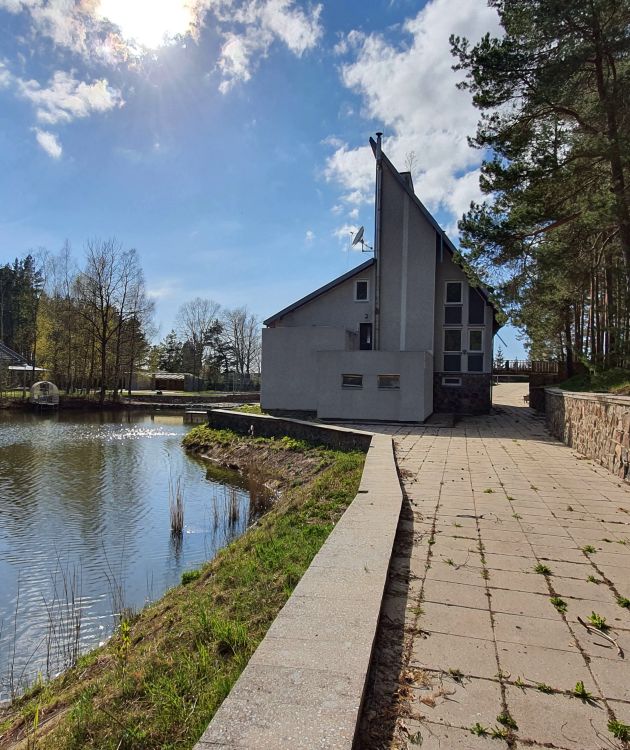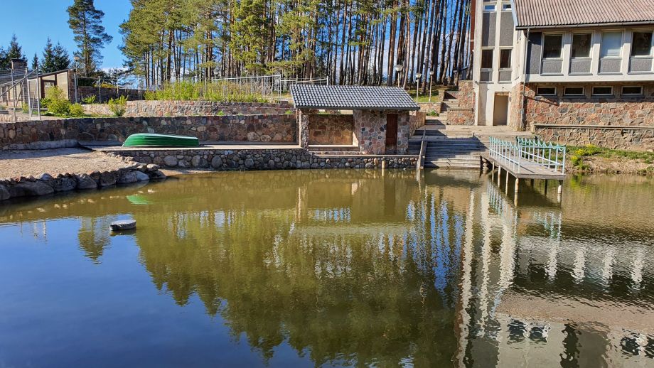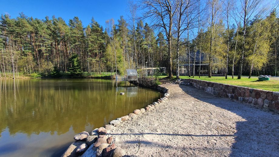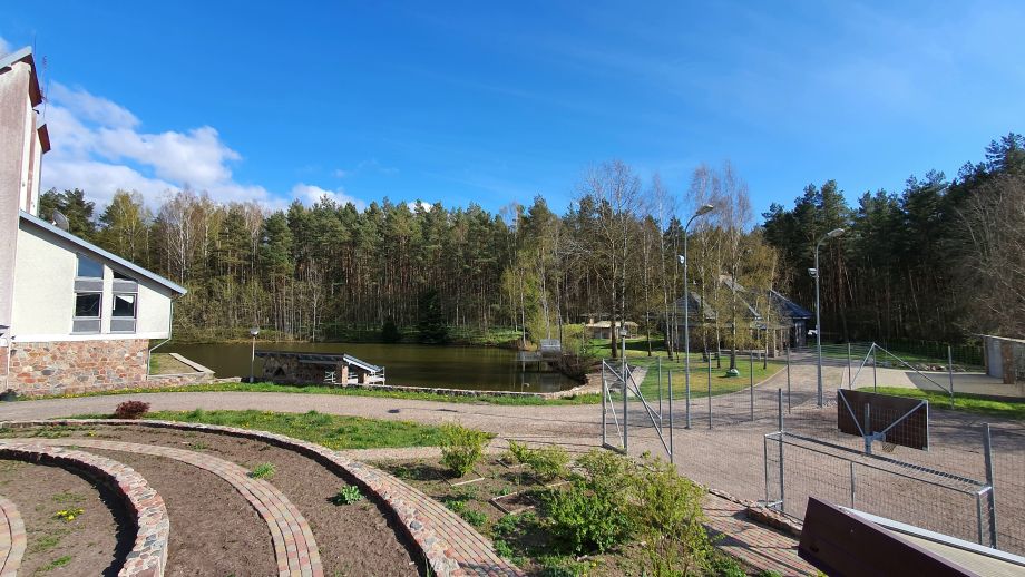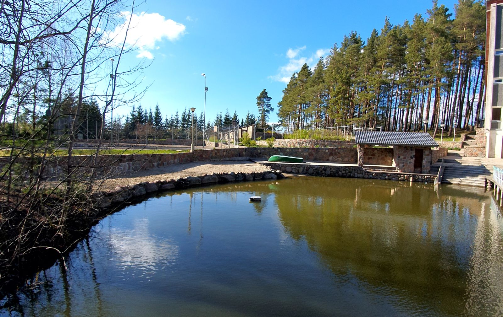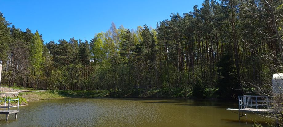 Большой, глубокий пруд с двумя пирсами, лодочной станцией, песчаным пляжем и отмелью, беседками, а также видовым разнообразием рыб;